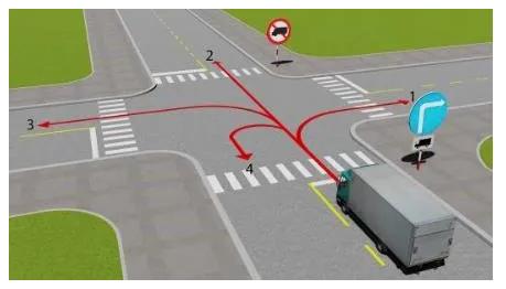 Câu hỏi 27: Theo hướng mũi tên, những hướng nào xe tải được phép đi?