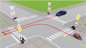 Câu hỏi 32: Các xe đi theo hướng mũi tên, xe nào vi phạm quy tắc giao thông ?