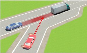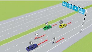 Câu hỏi 34: Trong tình huống dưới đây, xe con màu đỏ nhập làn đường cao tốc theo hướng mũi tên là đúng hay sai ?